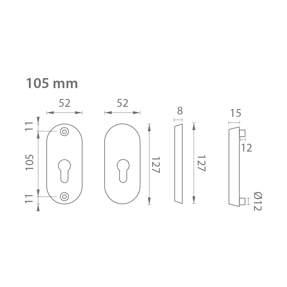 Zusätzliche Rosette mit PZ -Einsatzloch mit 105 mm Schraublochabstand hat eine Gesamtlänge von 127 mm und eine Dicke von 15 mm.