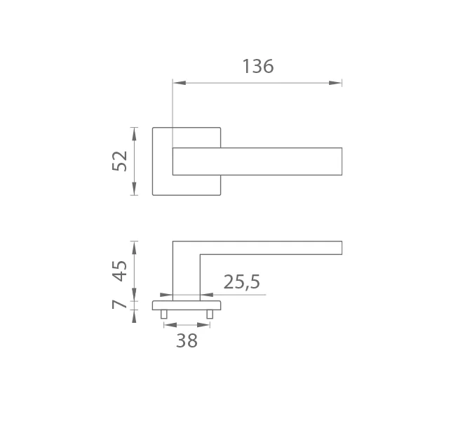 Der Rosettengriff für eine Innentür mit einer quadratischen Rosette besteht aus hochwertigen Materialien - zamak und hat eine Oberflächenbehandlung. Die Rosette hat Abmessungen von 52x52 mm und eine Dicke von nur 7 mm. Das minimalistische Design der Rosette mit hoher Stabilität der. Türgriff hat eine subtile Wirkung und lässt Raum für das Design des Griffs selbst, um sich abzuheben.