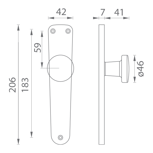 Die Tür gerade repariert Knauf Auf dem ovalen Schild besteht aus Aluminium und hat eine Oberflächenbehandlung. Die Kugel hat einen Durchmesser von 46 mm und der ovale Schild misst 42 mm x 206 mm.