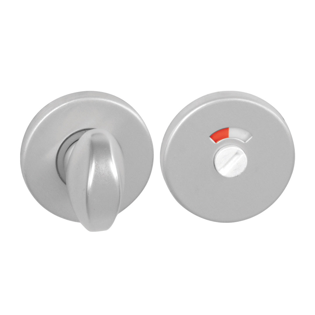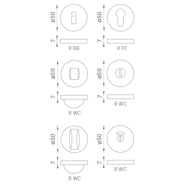 Die runde Rosette besteht aus Aluminium und hat eine Oberflächenbehandlung. Die Rosette hat einen Durchmesser von 50 mm, eine Dicke von 7 mm und ein ovales Loch für einen Innenschlüssel (BB), ein Loch für einen Zylindereinsatz (PZ), WC mit integriertem Schlüssel und Indikator. Das Paket enthält 2 Stücke Rosetten (ein Paar) und die Toilettenrosetten befinden sich im Paket als Set.