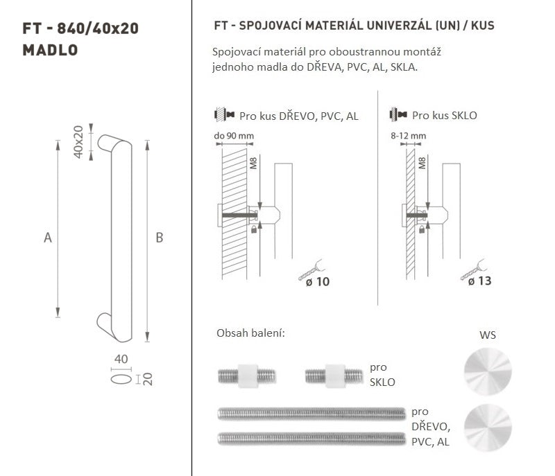 Der Türgriff besteht aus hochwertigem Edelstahl, der als Edelstahl bekannt ist, und ist oberflächen behandelt. Das Griffprofil hat Abmessungen von 40 x 20 mm. Das universelle (UN) -Set enthält Verbindungselemente für die doppelseitige Montage von zwei Handläufen in Holz, PVC, AL, Glas.