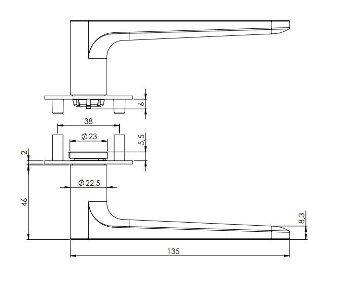 Der Handlungsmechanismus beinhaltet eine Rücklauffeder. Die Vorsprünge auf der Rosette verhindern, dass sie sich dreht, und die Schrauben zum Durchschreiten der gesamten Breite der Tür garantieren eine stärkere und stabilere Anpassung der Ausstattung.