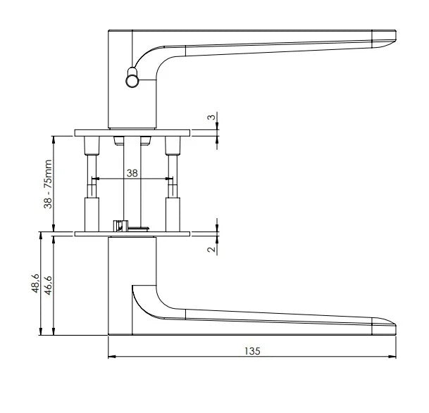 Der Handlungsmechanismus beinhaltet eine Rücklauffeder. Die Vorsprünge auf der Rosette verhindern, dass sie sich dreht, und die Schrauben zum Durchschreiten der gesamten Breite der Tür garantieren eine stärkere und stabilere Anpassung der Ausstattung.