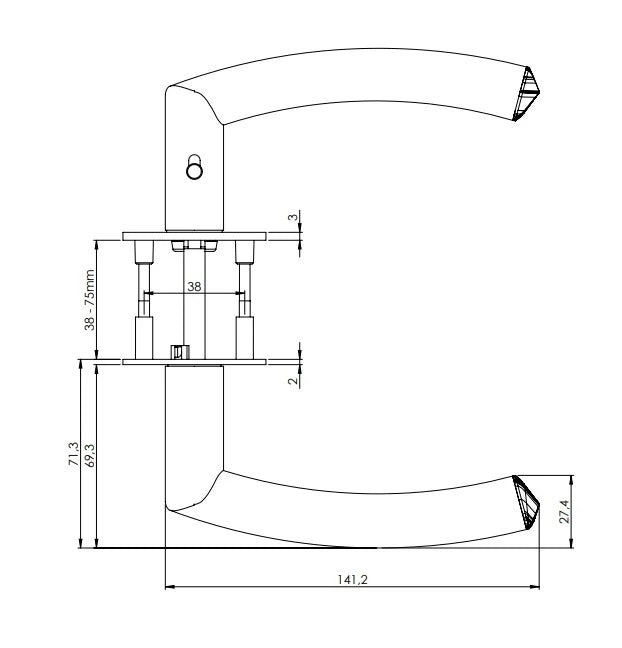 Der Handlungsmechanismus beinhaltet eine Rücklauffeder. Die Vorsprünge auf der Rosette verhindern, dass sie sich dreht, und die Schrauben zum Durchschreiten der gesamten Breite der Tür garantieren eine stärkere und stabilere Anpassung der Ausstattung.