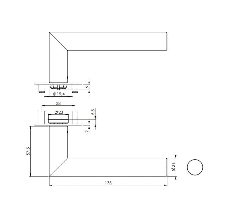 Der Mechanismus des Griffs enthält eine Rücklauffeder. Die Vorsprünge auf der Rosette verhindern, dass sie sich dreht, und die Schrauben zum Durchschreiten der gesamten Breite der Tür garantieren eine festere und stabilere Anpassung der Ausstattung.
