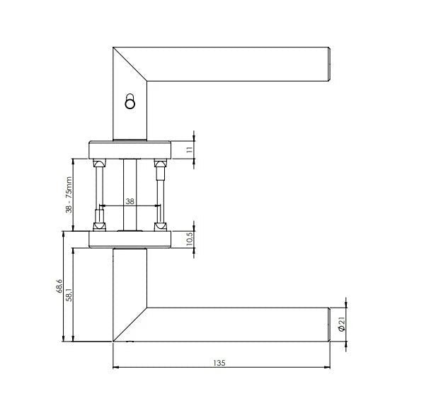 Der Handlungsmechanismus beinhaltet eine Rücklauffeder. Die Vorsprünge auf der Rosette verhindern, dass sie sich dreht, und die Schrauben zum Durchschreiten der gesamten Breite der Tür garantieren eine stärkere und stabilere Anpassung der Ausstattung.