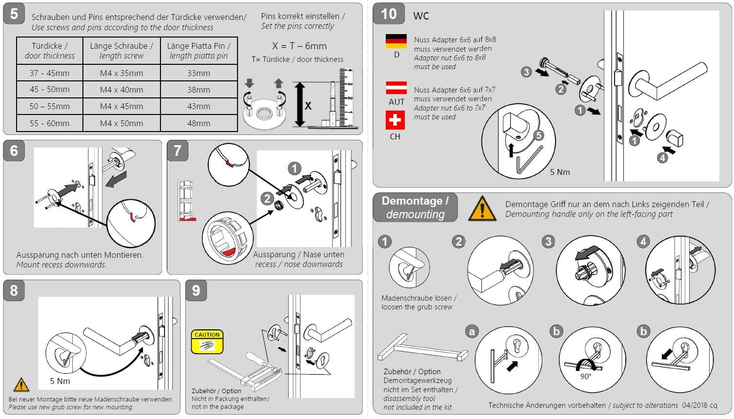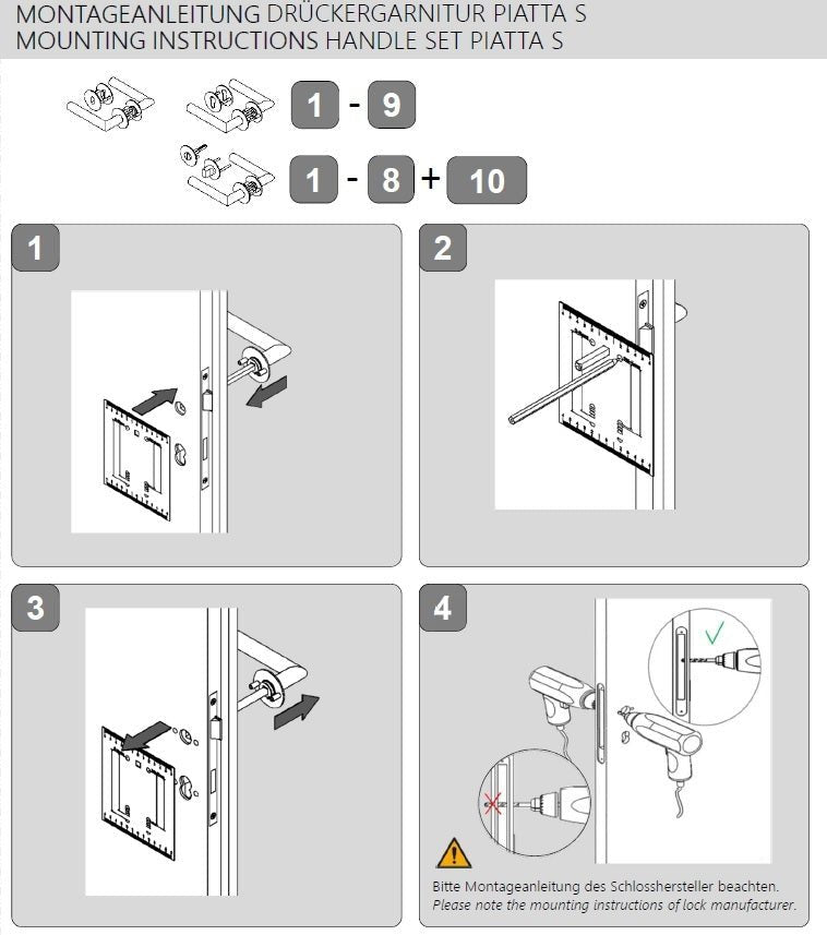 Die Standardbeschläge werden mit Schrauben und einem Quadrat (8x8 mm) für eine Türstärke von 38 - 45 mm geliefert.