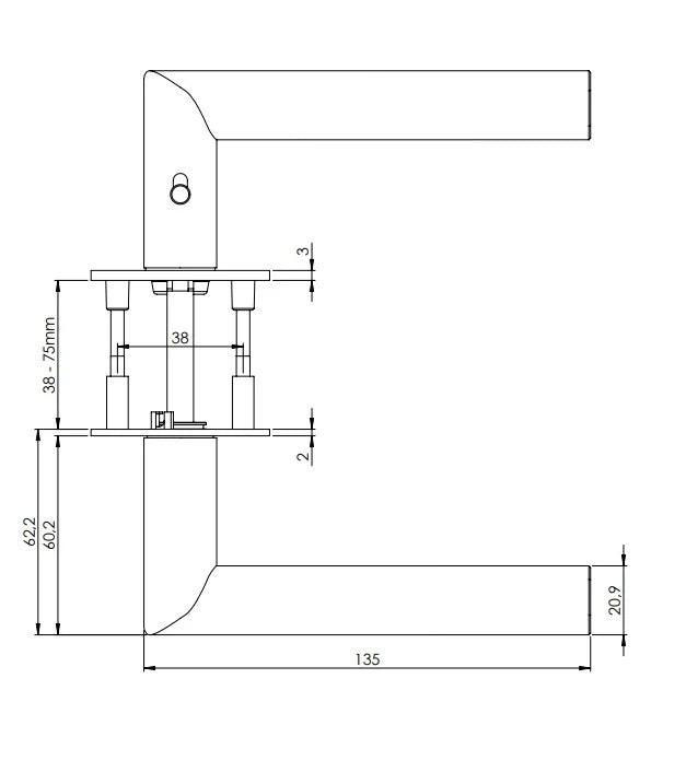 Der Handlungsmechanismus beinhaltet eine Rücklauffeder. Die Vorsprünge auf der Rosette verhindern, dass sie sich dreht, und die Schrauben zum Durchschreiten der gesamten Breite der Tür garantieren eine stärkere und stabilere Anpassung der Ausstattung.