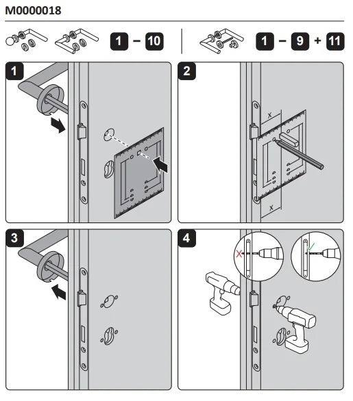 Standardmäßig werden die Armaturen mit Schrauben und einem Quadrat (8 x 8 mm) für die Dicke der Tür 38 - 45 mm geliefert.