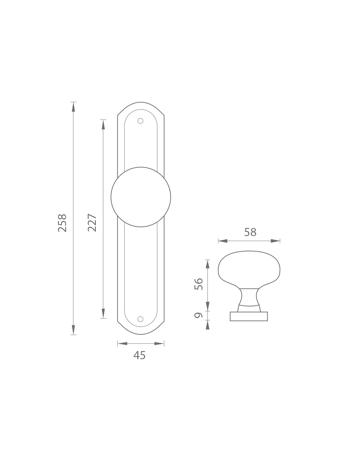 Der Knauf hat einen Durchmesser von 58 mm und der Schild hat Abmessungen von 45 mm x 258 mm.