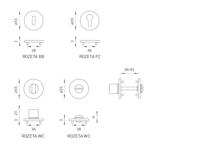 Die runde Rosette besteht aus hochwertigem Edelstahl, bekannt als Edelstahl, und ist oberflächen behandelt. Die Rosette hat einen Durchmesser von 55 mm, eine Dicke von nur 3 mm und ein ovales Loch für einen Innenschlüssel (BB), ein Loch für einen Zylindereinsatz (PZ) oder einen WC -Set mit einem installierten Schlüssel. Das Paket enthält 2 Stücke Rosetten (ein Paar) und die Toilettenrosetten befinden sich im Paket als Set.