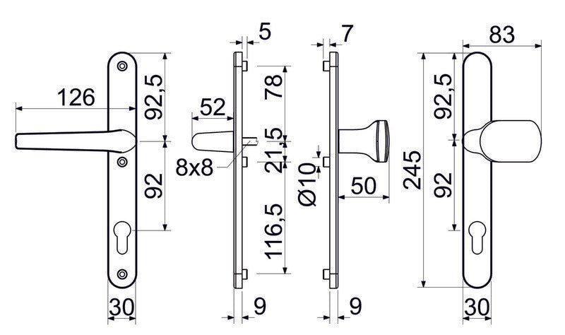 Dieser Griff/Knopf-Set für Plastikentüren mit einer Dicke zwischen 55 und 88 mm entwickelt und kann durch die Verkürzung der mitgelieferten Schrauben Türen so dünn wie 40 mm aufnehmen. Verfügt über eine 8x8mm quadratische Spindel mit 92 -mm -Abstand und verfügt über drei M6x100 -mm -Anschlussschrauben für die sichere Installation. Technische Spezifikationen enthalten.