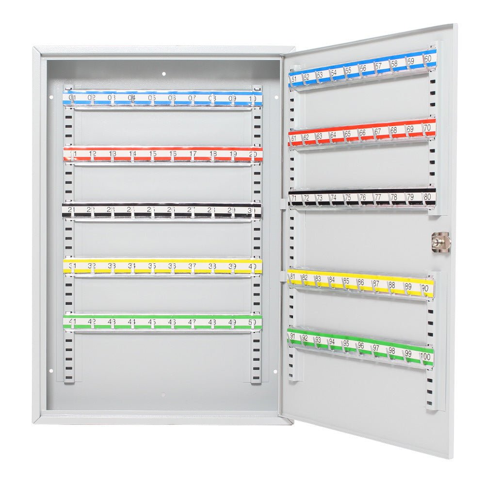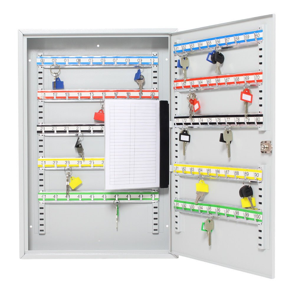 Die S100 -Schlüssellaste ermöglicht eine klare Anordnung von Schlüssel. Es besteht aus hochwertigem Blechstahl und enthält Platz für 100 verzinkte Schlüsselhaken. Die Lamellen, auf denen die Haken fixiert sind, können vertikal bewegt werden. 100 farbige Tags können für bessere Datensätze verwendet werden. Das Paket enthält das erforderliche Verankerungsmaterial für die Befestigung an der Wand.