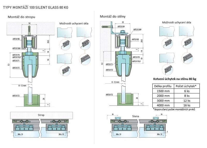 Die Verpackung des Schiebesystems SILENT GLASS umfasst Abdeckungen zur Abdeckung der Glashalter, es ist jedoch möglich, eine Aluminiumabdeckung zu erwerben, um die gesamte Breite der Glastür abzudecken. Das SILENT GLASS-System ermöglicht die Befestigung von Glas mit einem Schnitt nahe dem Rand, die Befestigung von Glas mit einem Schnitt vom Rand des Glases oder die Befestigung ohne einen Schnitt des Glases.