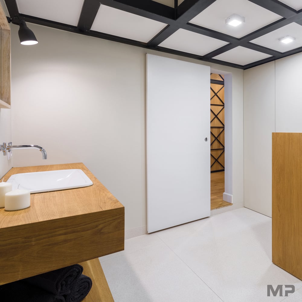 Das versteckte Gleitsystem ist eine moderne Lösung für Schiebetüren ohne Vorhang und Rahmen. Der Gleitschiene ist in der Tür versteckt und macht das gesamte System fast unsichtbar.