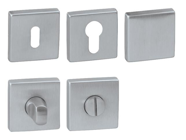 Die quadratische Rosette besteht aus hochwertigem Edelstahl, bekannt als Edelstahl, und ist oberflächen behandelt. Die Rosette hat Abmessungen von 50 mm x 50 mm und ein ovales Loch für einen Innenschlüssel (BB), ein Loch für einen Zylindereinsatz (PZ), einen Toilettensatz mit eingebauter Schlüssel oder eine Rosette ohne Loch, den sogenannten Stecker. Das Paket enthält 2 Stücke Rosetten (ein Paar) und die Toilettenrosetten befinden sich im Paket als Set.